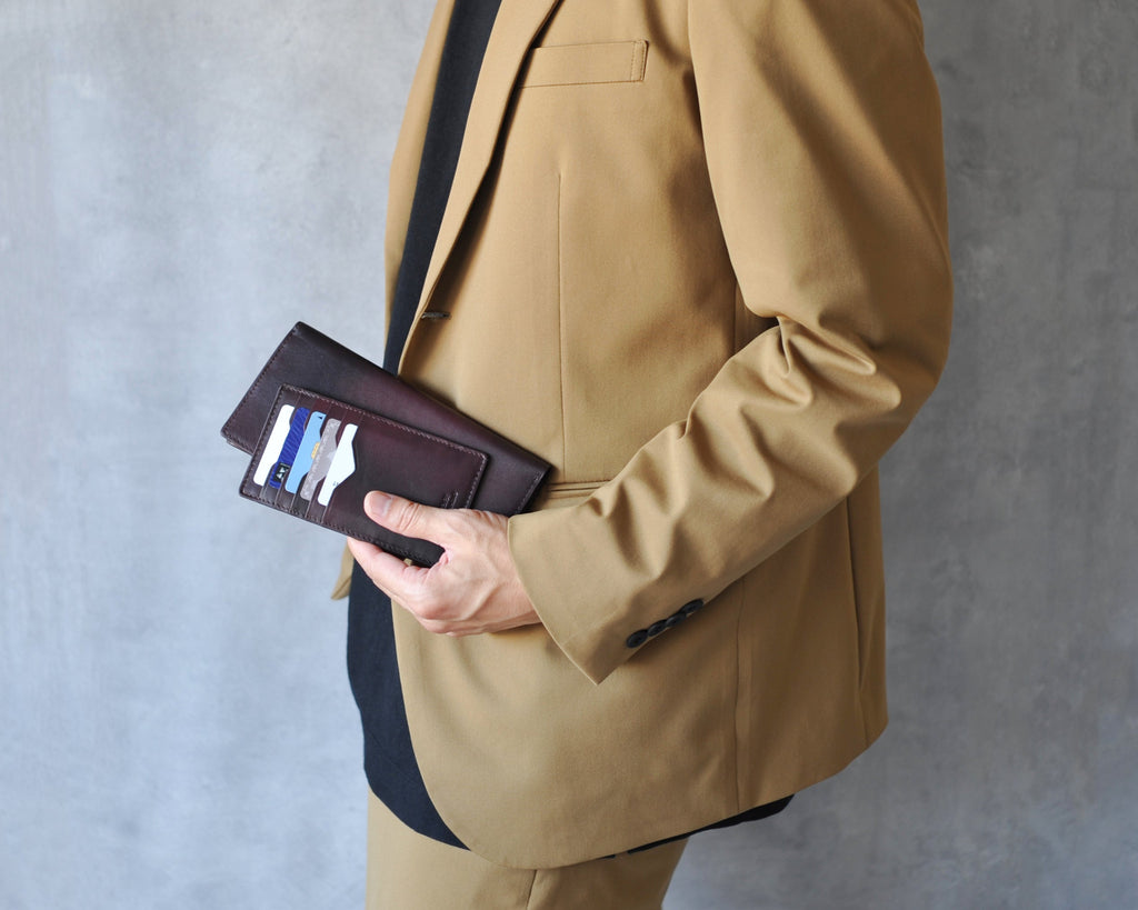 手染めにより仕上げられた程よいムラ感と重厚感のある佇まいを最大限に生かし、流行に囚われないスマートなデザインに仕上げました。経年変化と共により深みのある色味に仕上がり、長くお使い頂ける逸品です。