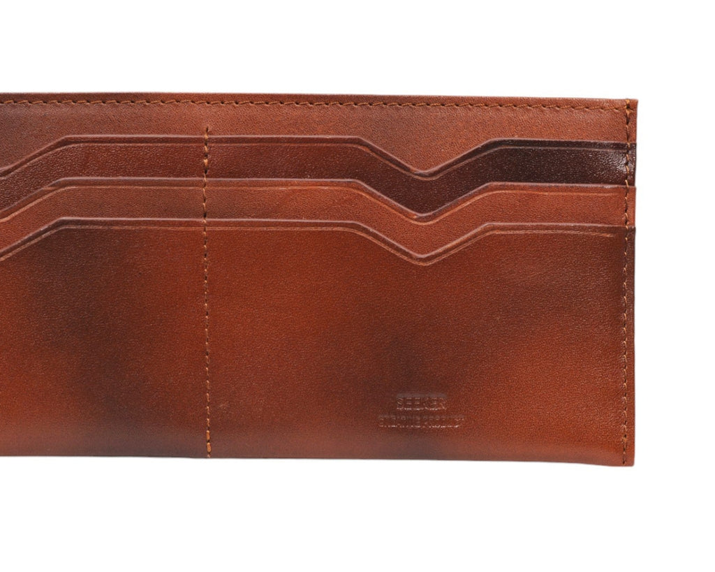 張り感のあるナチュラルレザーをSEEKERこだわりのクラシックカラーに仕上げたアンティーク調のレザーです。手染めにより仕上げられた程よいムラ感と重厚感が特徴です。
